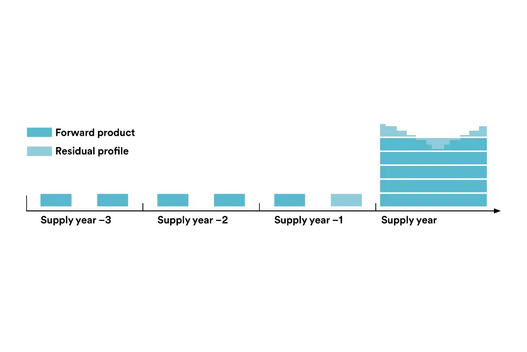 - Prior to delivery, demand is covered by procuring the residual profile and calculating the full supply price