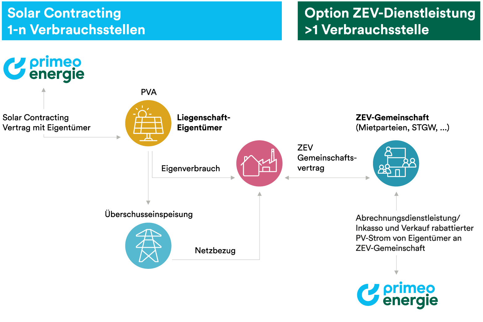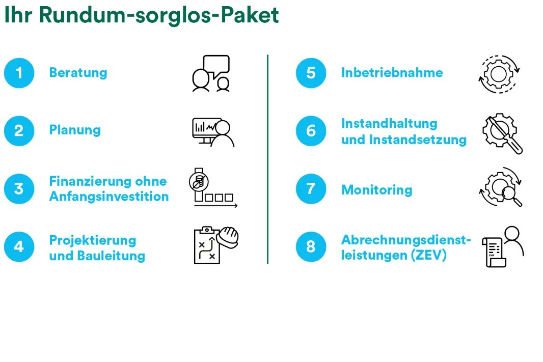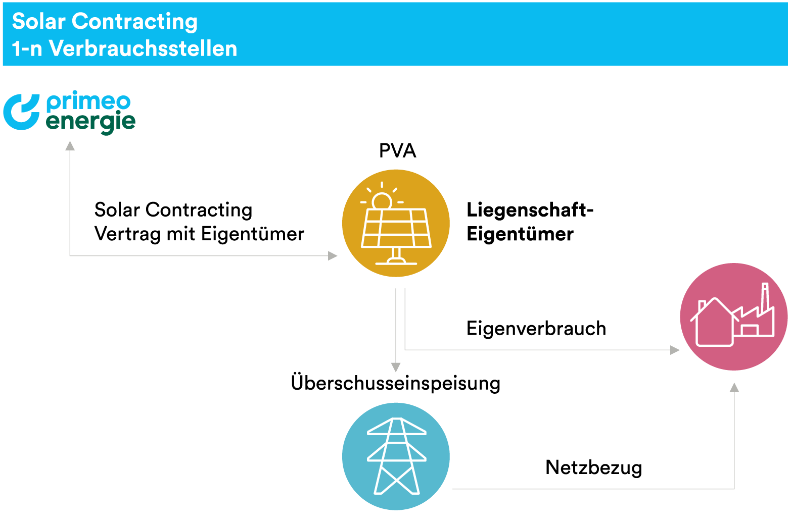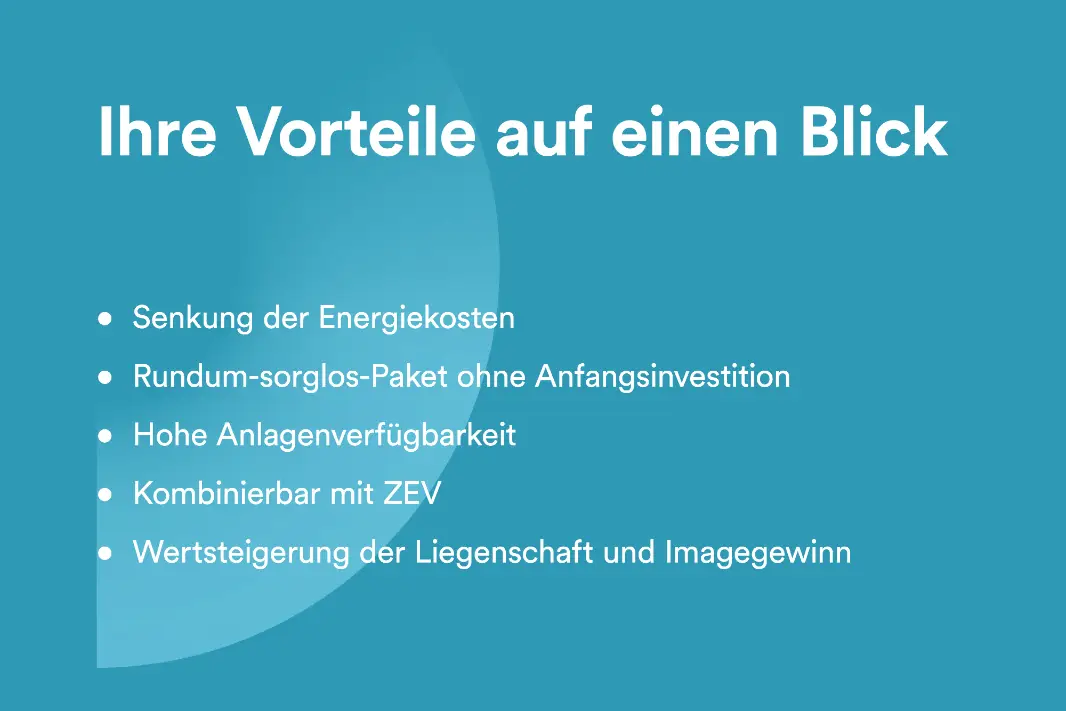 Primeo Energie finances, realises and maintains the entire photovoltaic system on your property. You benefit from the converted solar energy, which you use sustainably directly in your own consumption. In addition, the surplus solar energy that is fed into the grid is credited to you by the distribution grid operator. Primeo Energie will operate the photovoltaic system for 25 years and will charge you an annual contracting fee. After 25 years of contracting, the photovoltaic system belongs to you.