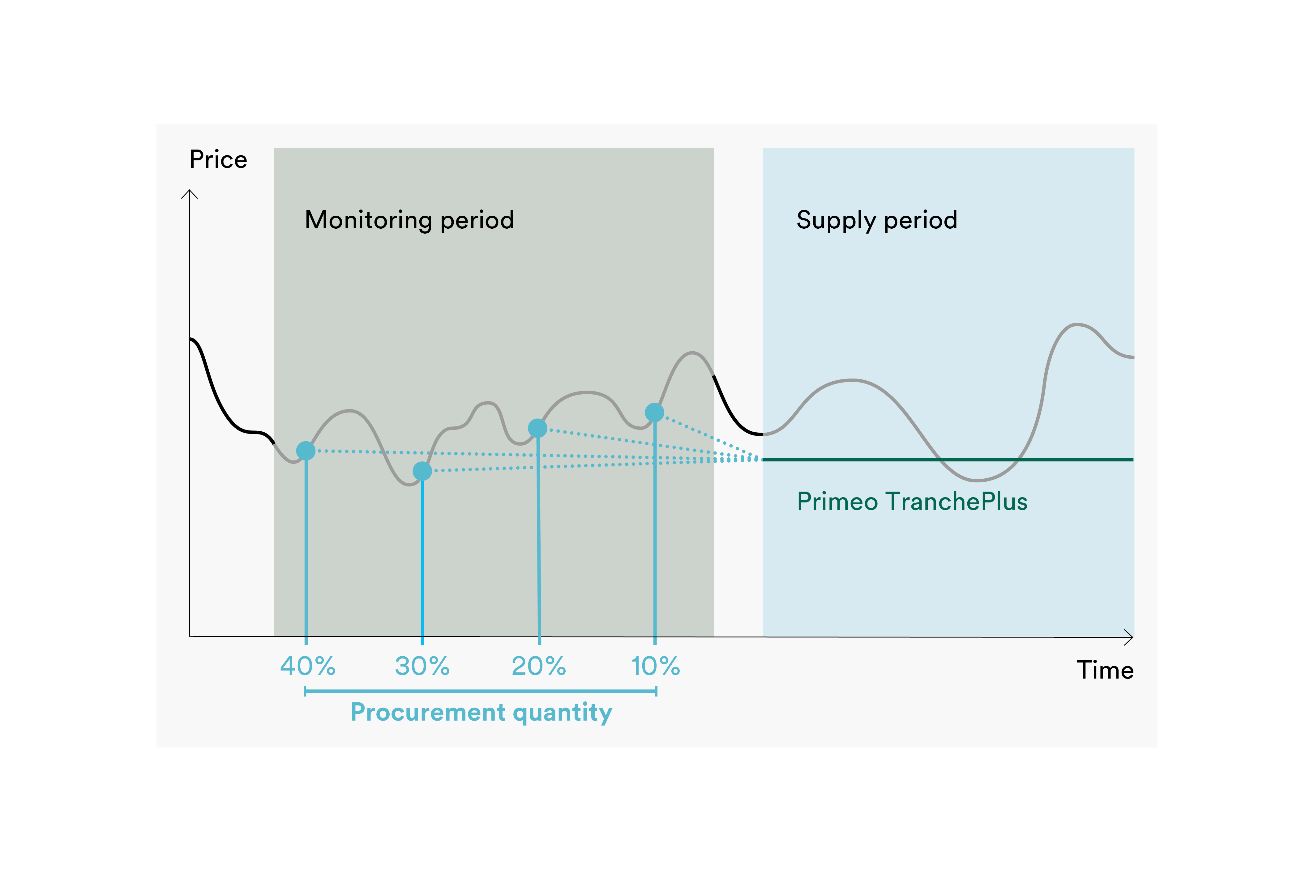 With Primeo Plus you divide your future energy requirements into defined slices and procurement dates. The procurement takes place in a period of up to 3 years before the start of delivery. We monitor the market for you and trigger the sliced procurement when agreed price limits are reached.