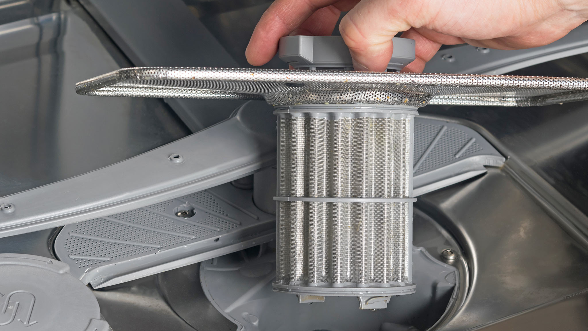 Essensreste können den Filter des Geschirrspülers verstopfen. Dadurch arbeitet die Maschine nicht mehr so gut und vergeudet Strom. Heisst: regelmässig den Filter reinigen.