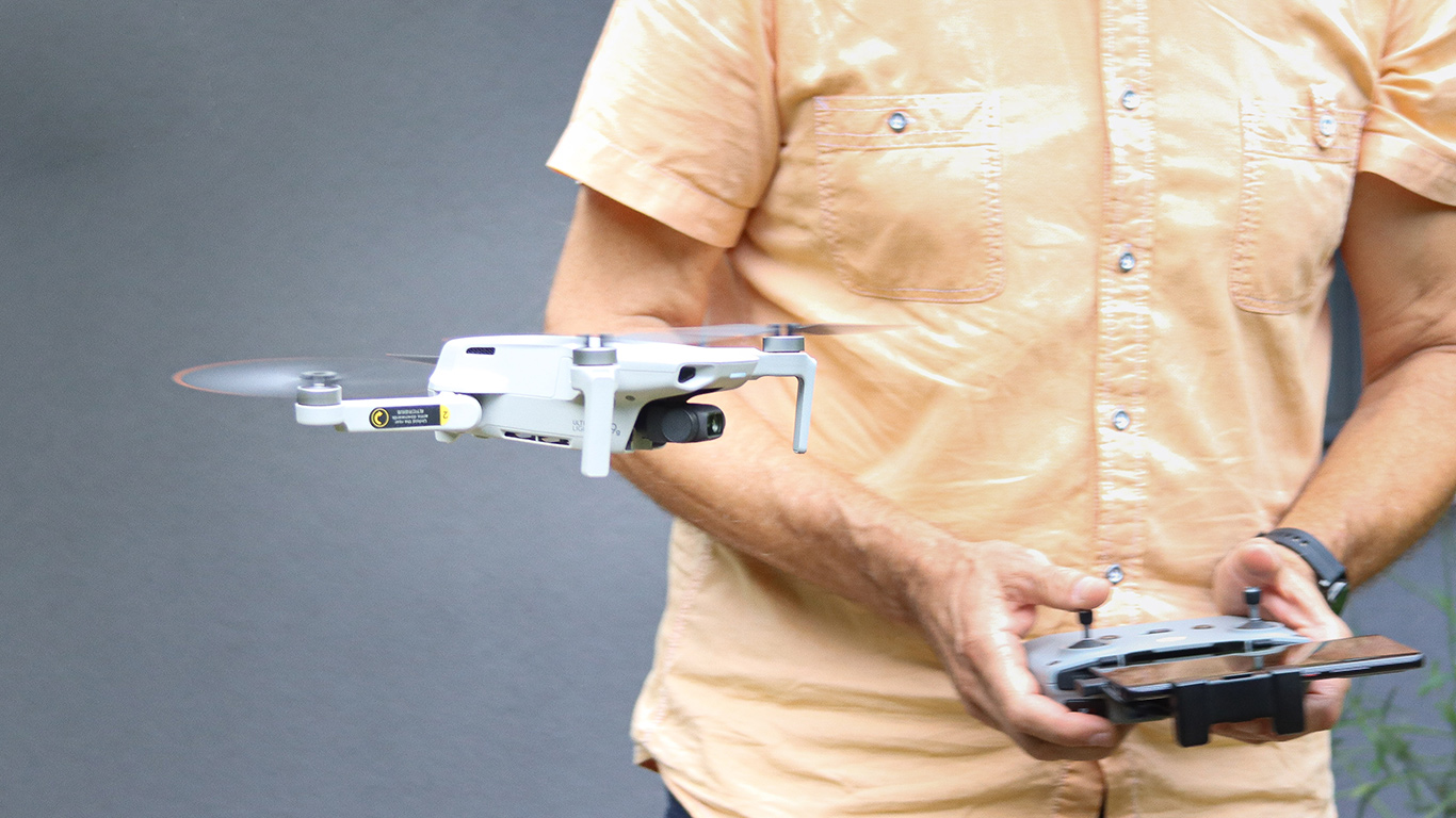 Zur Begehung gehört auch ein Drohnenflug: Damit prüft Räber den optimalen Standort einer potenziellen Solaranlage.