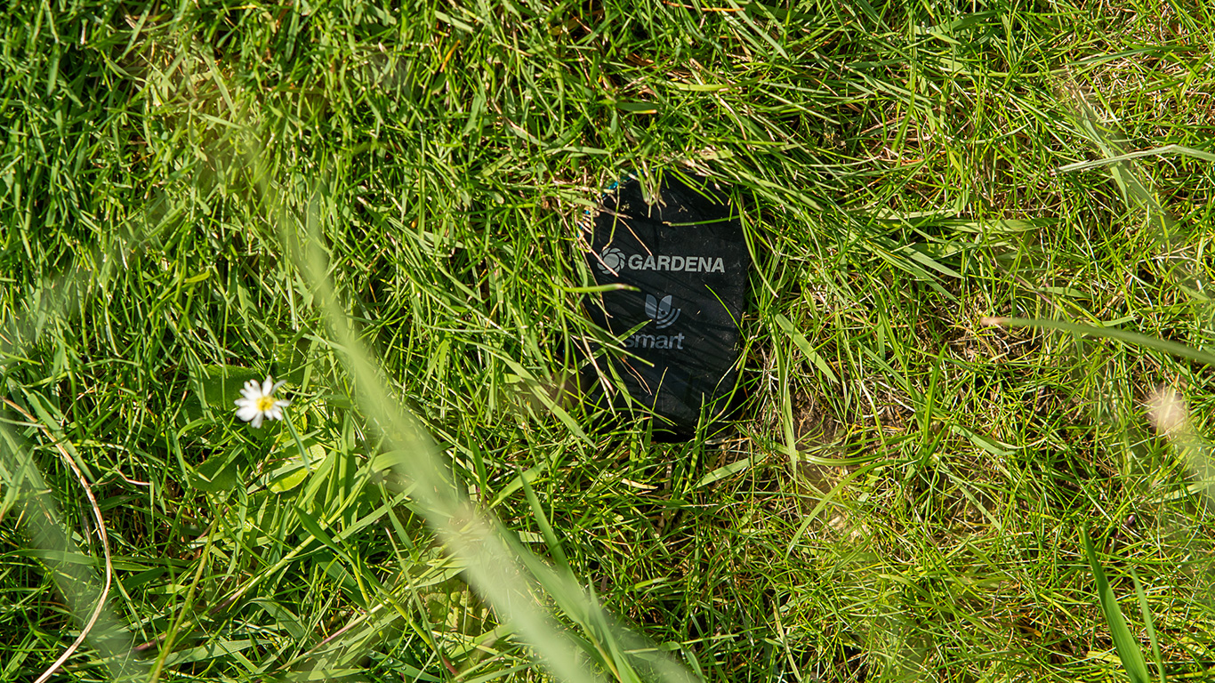So saftig grün, wie die Wiese dank des Mähroboters und ein wenig Dünger wächst, ist im Nu fast nichts mehr vom Bodensensor zu sehen.