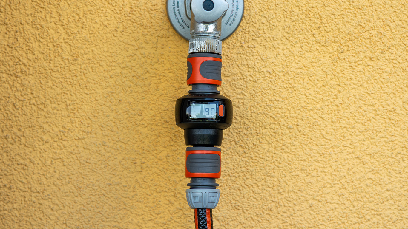Der smarte Wasserzähler hilft, den Wasserverbrauch stets im Auge zu behalten. Er misst Tages- und Saisonverbrauch, einzelne Giessmengen und den aktuellen Durchfluss. Schon bei der ersten Bewässerung waren es 422 Liter – ein echter Augenöffner. Der Wasserzähler lässt sich direkt am Wasserhahn oder am Schlauchende montieren.