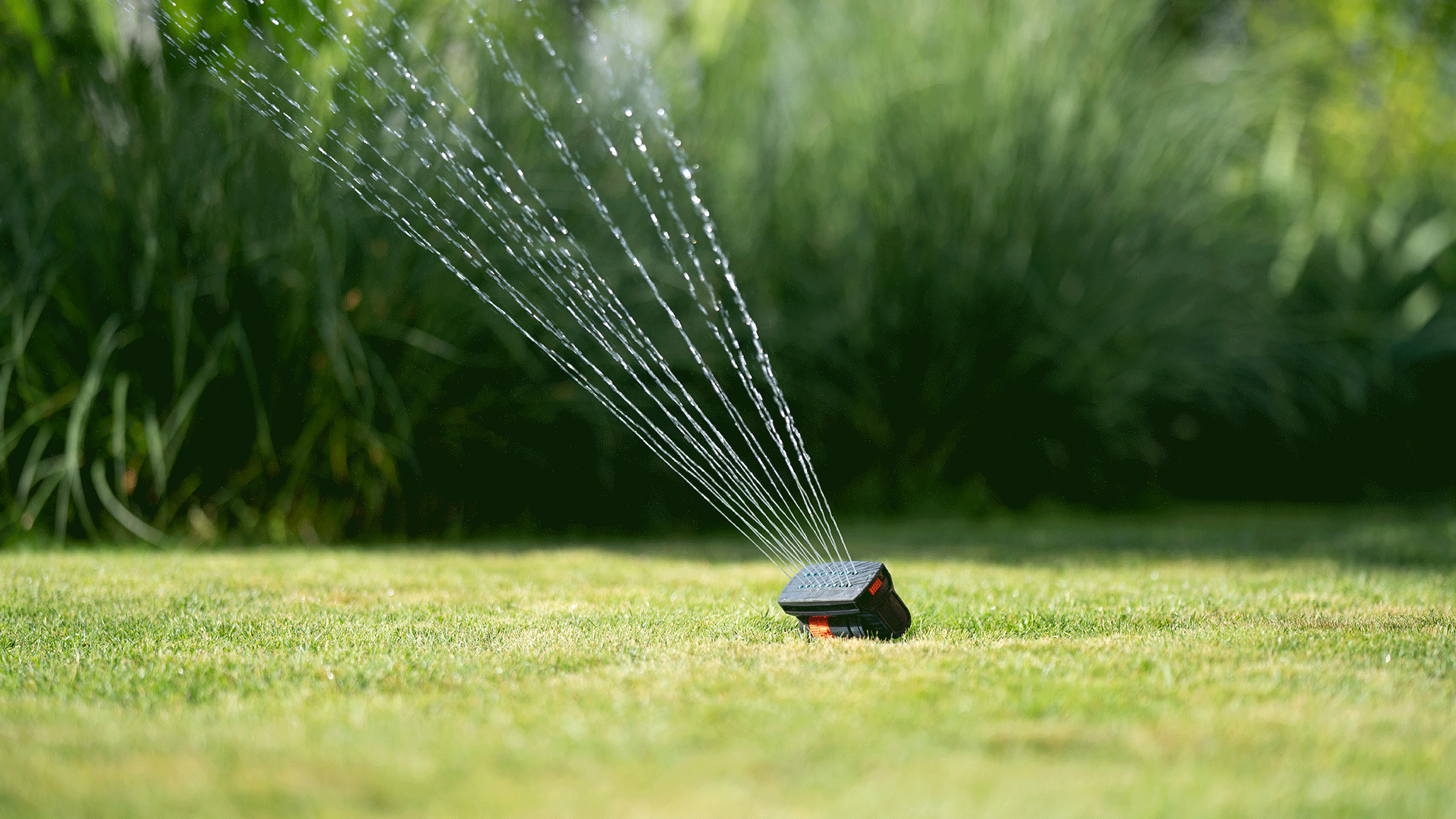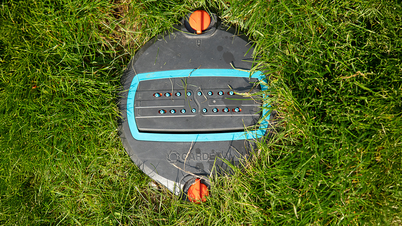 Der Wassersprenkler lässt sich ausser Dienst eben zur Wiese herunterfahren. So kann auch der Rasenmähroboter problemlos drüberfahren.