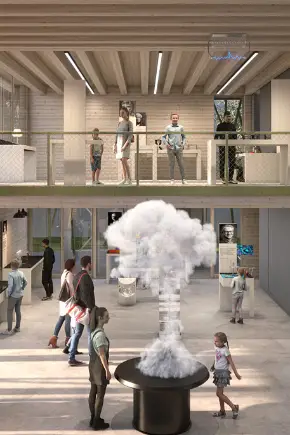 The new building is at the heart of the revised concept for visitors. Internally, the new building aims to give visitors a general idea about the sun, has an interactive zone for learning about climate and energy, and features workshops and an energy lab with special equipment. The visitor and knowledge centre also serves as a meeting place, an event room, a small pop-up shop, as well as a starting point for guided tours and themed walks. And its roof offers a wonderful view of the surrounding area.