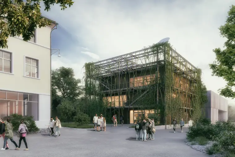 The "Faraday" project by Rapp Architects from Münchenstein won the architecture competition for the new building in 2019. The delicate, simple design adapts the basic geometric shape of four squares, with greenery growing along a three-dimensional lattice structure made of recycled high-voltage masts. There are plans to include as many ecologically compatible construction materials as possible with a low proportion of grey energy as well as recyclable materials.