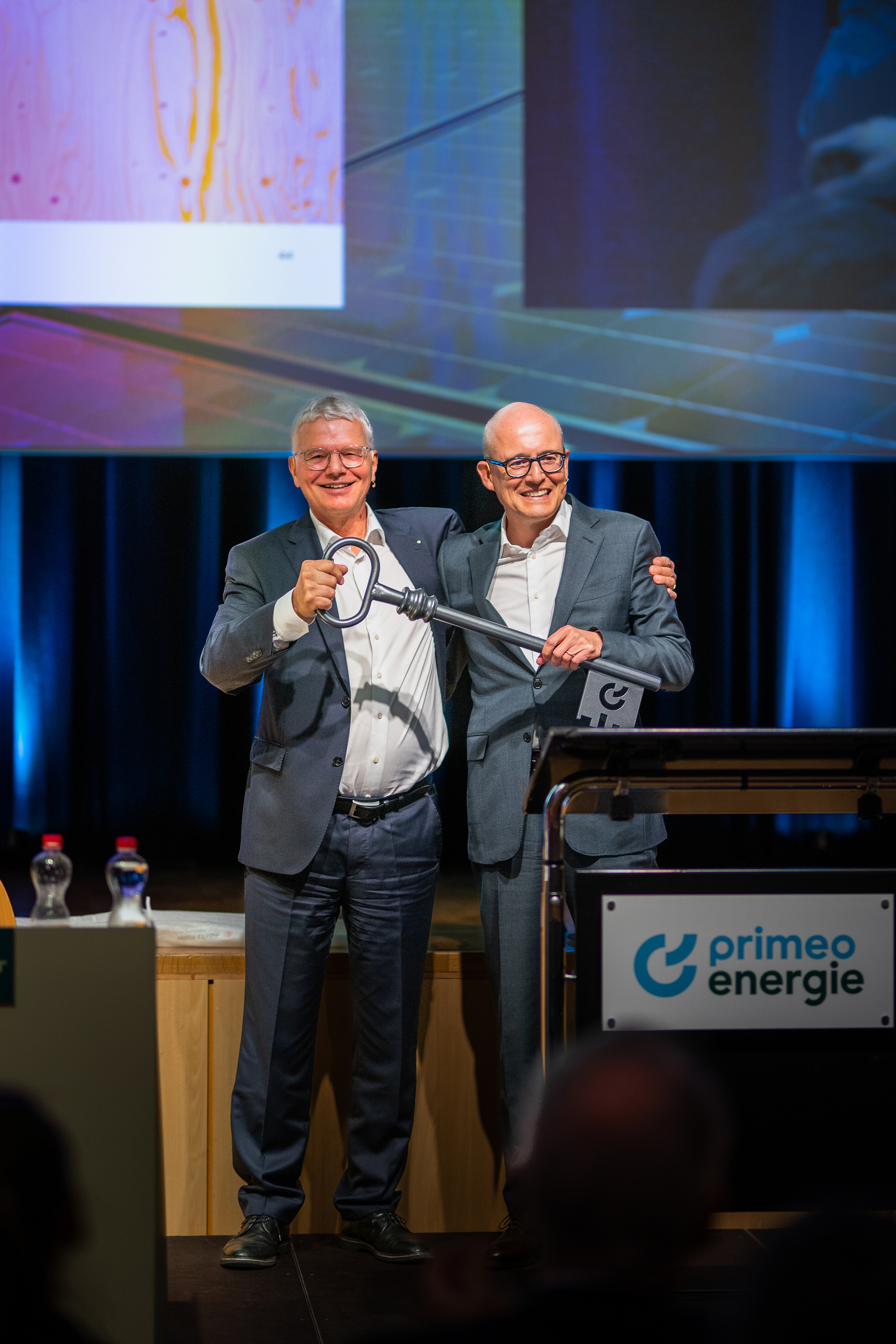 Nach 11 Jahren erfolgreicher Tätigkeit als CEO der EBM-/Primeo Energie-Gruppe übergibt Dr. Conrad Ammann den Stab an Cédric Christmann. VR-Präsident Andreas Büttiker würdigte in seiner Laudatio Conrad Ammann für seine nachhaltiges, erfolgreiches Engagement. «Mit Conrad Ammann verlässt uns ein ausgewiesener und in der gesamten Energiebranche anerkannter Experte. Dank seiner Fähigkeit, die wesentlichen Punkte zu erkennen und beharrlich zu verfolgen, hat er den Wandel von der alten EBM zur modernen Primeo Energie möglich gemacht.» Der neue CEO Cédric Christmann ist ein profunder Kenner der Energiebranche und des Elektrizitätsmarkts in der Schweiz und in Frankreich. Von 2005 bis 2016 war er Finanzchef von EBM/Primeo Energie, danach übernahm er die Leitung des Segments Elektrizitätsgeschäft. Während knapp 10 Jahren war er zudem verantwortlich für den Aufbau der erneuerbaren Energien. In diese Zeit fällt unter anderem die Gründung von aventron, dem heute zweitgrössten Schweizer Produzenten von neuen erneuerbaren Energien. Mit seinem umfassenden Energiewissen und seiner langjährigen Erfahrung in der Energiebranche ist Christmann prädestiniert, Primeo Energie zu einem wichtigen, führenden Akteur der Energiewende weiterzuentwickeln.