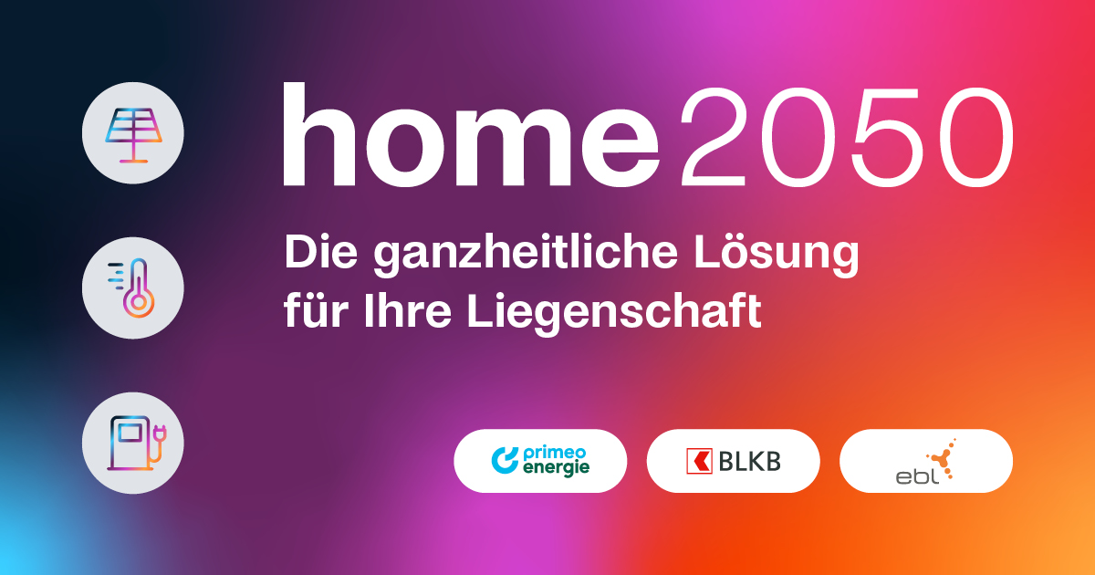 Primeo Energie, Basellandschaftliche Kantonalbank (BLKB) und die Genossenschaft Elektra Baselland (EBL) bauen ihr gemeinsames Angebot «sun2050.ch» zu «home2050.ch» aus. Hausbesitzerinnen und Hausbesitzer können über die Online-Plattform neu neben dem Solarpotenzial auch ihre Optionen für einen Heizungsersatz oder den Einbau von E-Ladestationen ermitteln und Angebote für die Installation und die Finanzierung einholen.