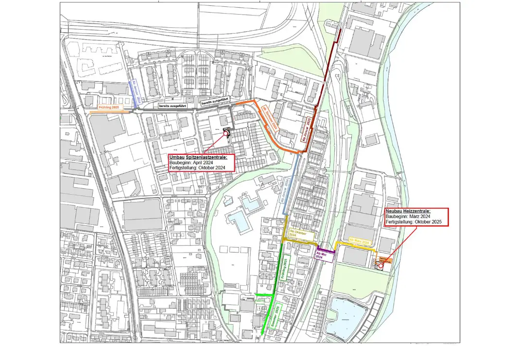 Die erste Bauetappe startet im Januar 2024 und dauert bis Ende 2025. In dieser Zeit wird die Heizzentrale am Weidenring neu errichtet und die Spitzenlastzentrale Im Egg umgebaut.