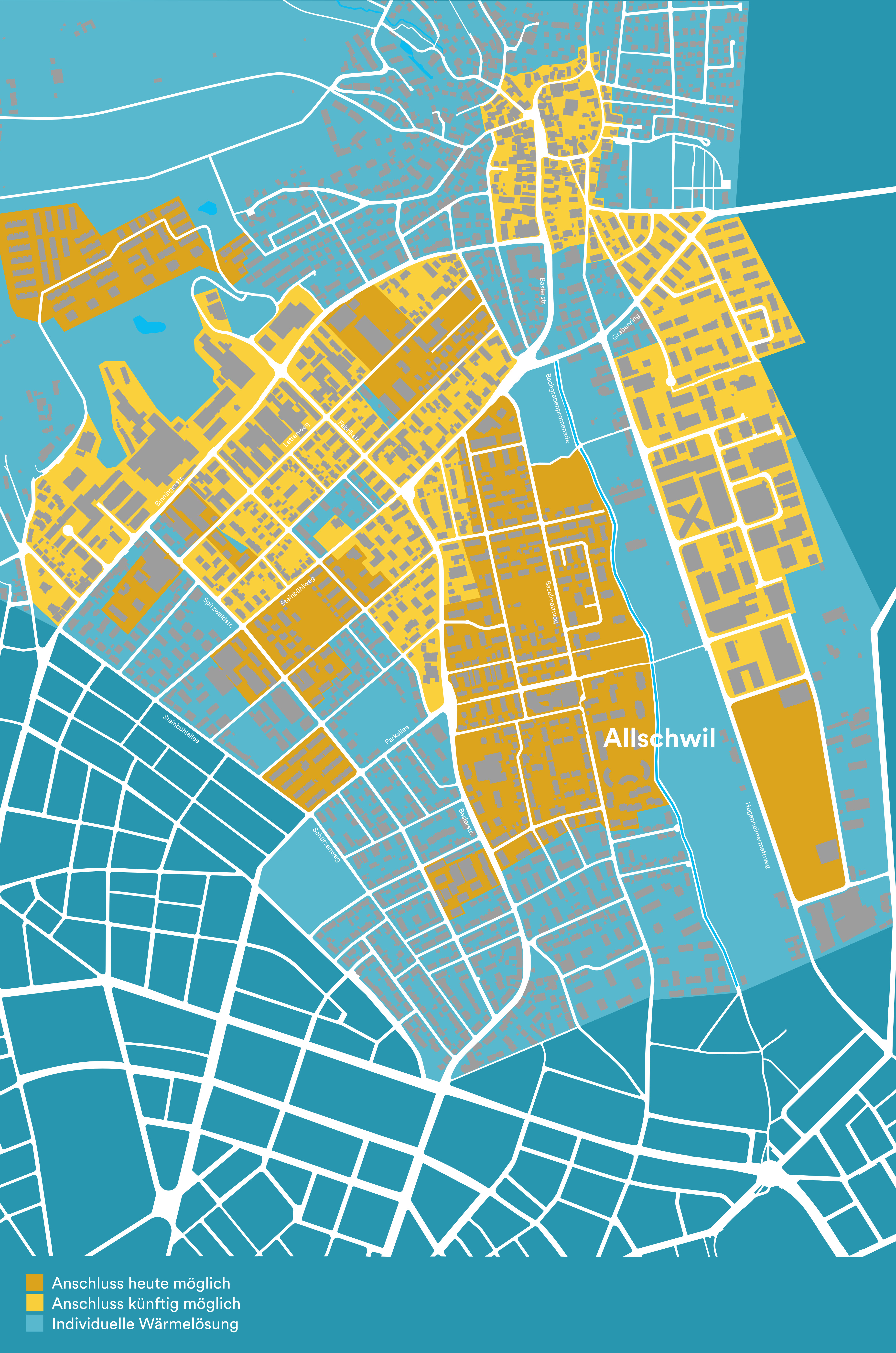 Allschwil verfügt aktuell über acht Wärmeverbünde. Diese werden in den kommenden Jahren weiter ausgebaut, modernisiert und auf erneuerbare Energieträger umgestellt. Ziel ist es, mehr Kundinnen und Kunden an die Verbünde anschliessen und mit sauberer Fernwärme versorgen zu können. So bringen wir die Energiewende gemeinsam mit den Kunden voran. Ein herausragendes Beispiel für die laufende Dekarbonisierung ist die Versorgung des Baselink-Areals in Allschwil mit erneuerbarer Wärme und Kälte. Hierfür wurde das grösste Erdsondenfeld der Nordwestschweiz angelegt. Für die Zukunft ist unter anderem eine neue grosse Heizzentrale mit Holzkessel und eine Wärmepumpe im Bachgrabenareal geplant.