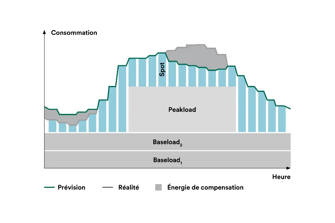 - La livraison est structurée et se compose des produits à terme ainsi que de l’énergie spot et de l’énergie de compensation