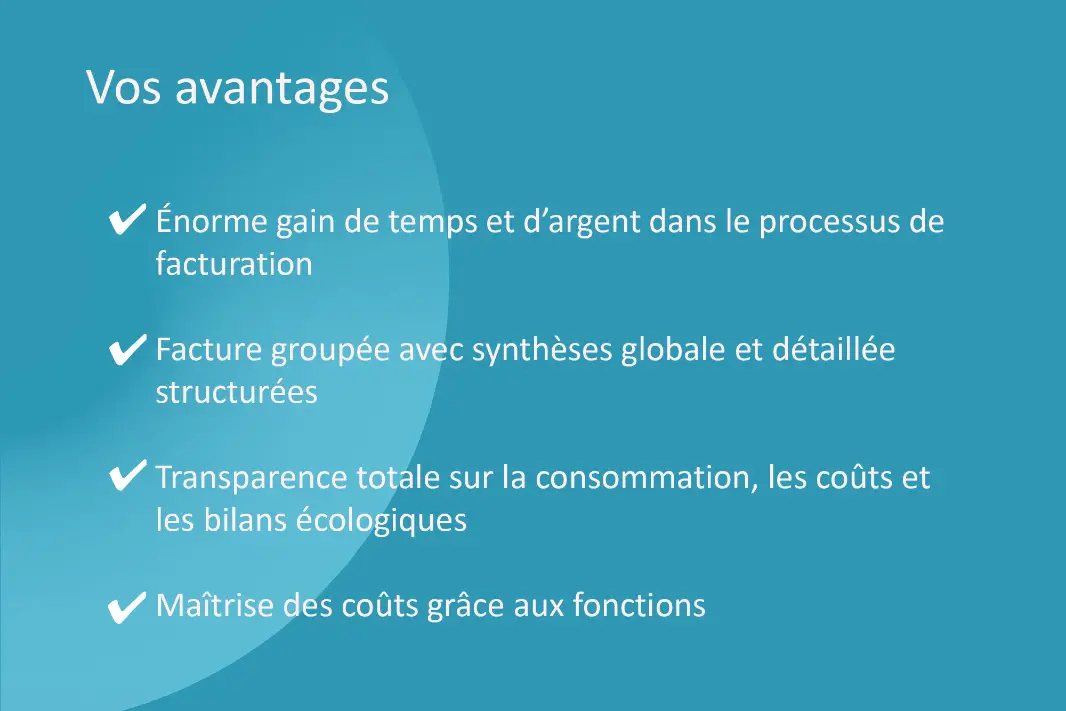 Avec le service Multi Energy Billing, vous réduisez sensiblement votre charge administrative de contrôle des factures et économisez de précieuses ressources. En outre, grâce à notre outil en ligne, vous obtenez plus de clarté sur vos valeurs financières et de consommation, et profitez des rapports personnalisés que nous mettons en place spécifiquement pour vos besoins.