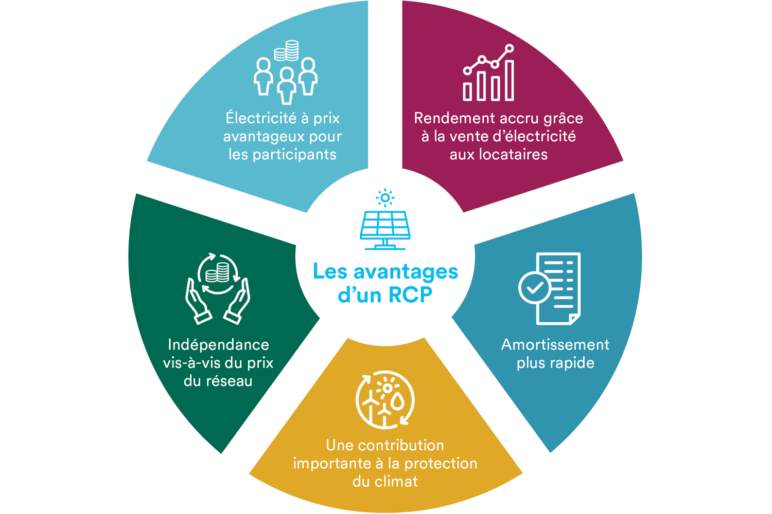 - Dans le même temps, les participants au RCP bénéficient de prix (de l'électricité solaire) plus avantageux que ceux pratiqués pour l'électricité provenant uniquement du réseau. Cela rend votre bien immobilier plus attractif.
