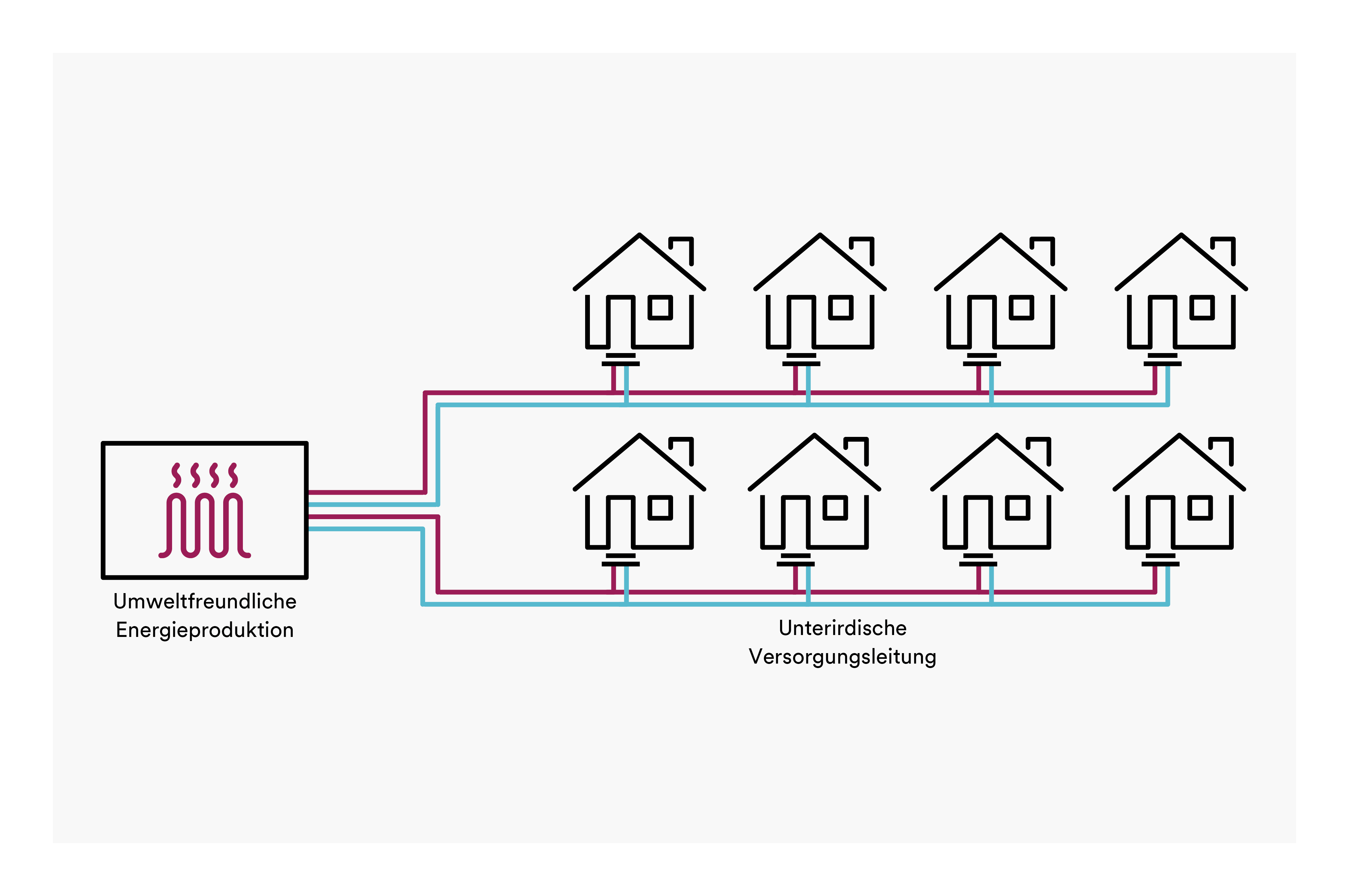 Dans un réseau de chaleur, la chaleur est produite dans une centrale de chauffage et distribuée par des tuyaux souterrains dans les immeubles raccordés d'un quartier. Cette solution est non seulement particulièrement efficace, mais aussi très confortable.