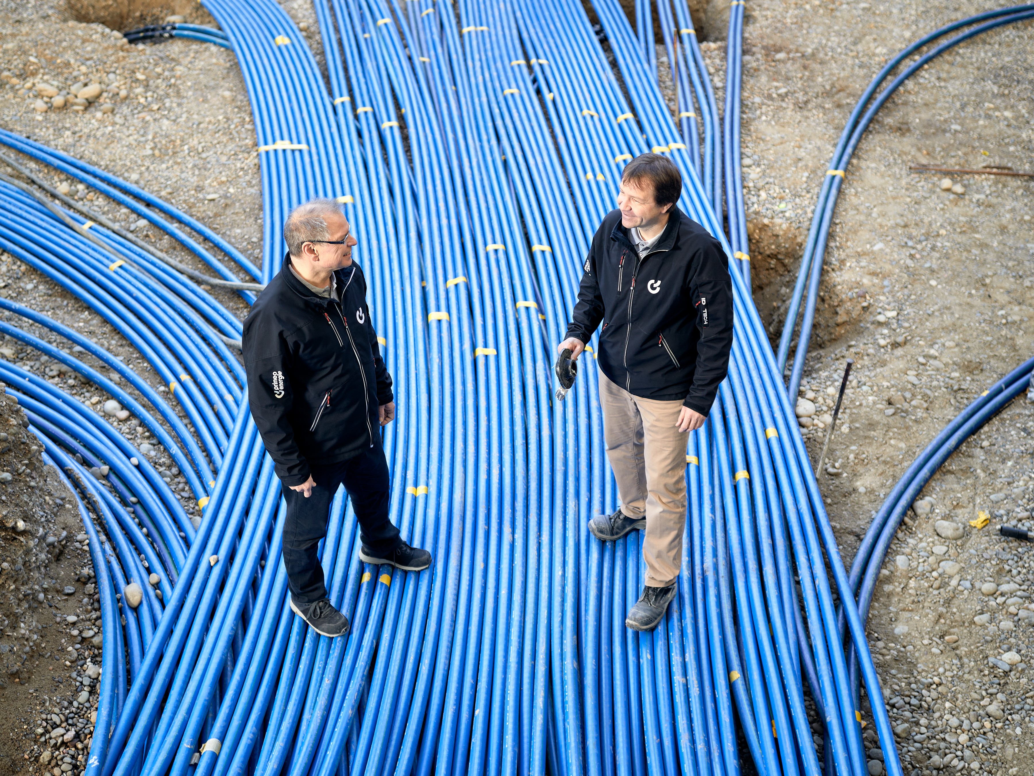 Mitarbeitende der Primeo Wärme AG auf dem Areal von BaseLink in Allschwil, das über Erdsonden mit Wärme und Kälte versorgt wird.