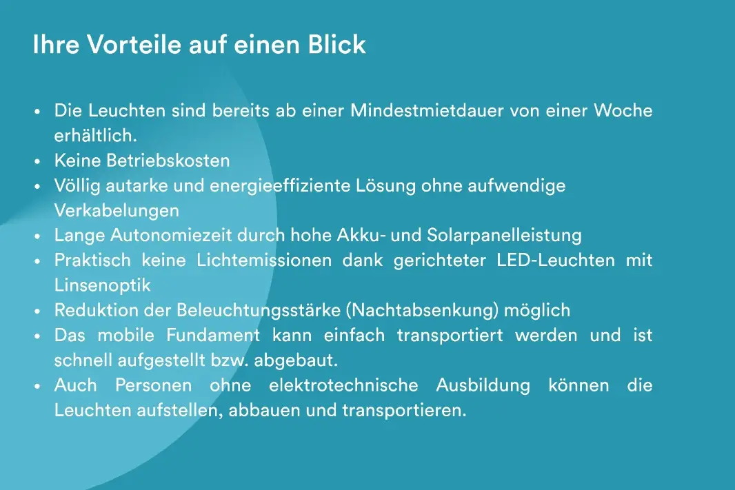 Für temporäre Anwendungen wie auf Baustellen, bei Events oder Provisorien eignen sich mobile Solarleuchten hervorragend. Hohe Kosten für Tiefbauarbeiten, Kabelinstallationen und Stromanschlüsse entfallen. Das macht mobile Solarleuchten zu einer wirtschaftlichen und attraktiven Lösung.