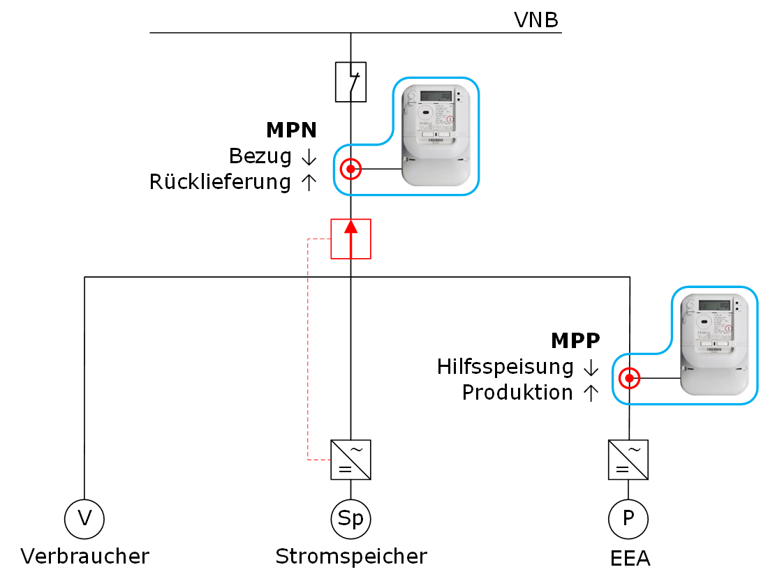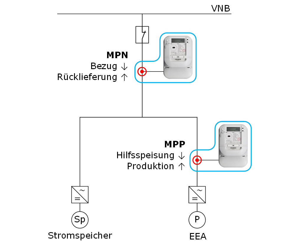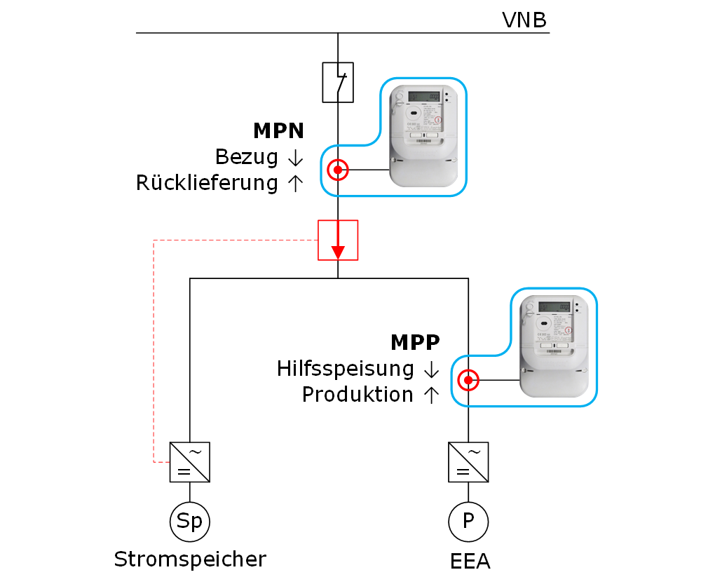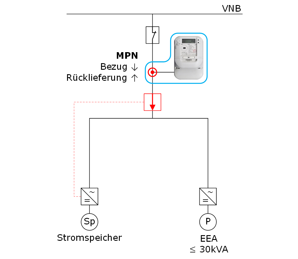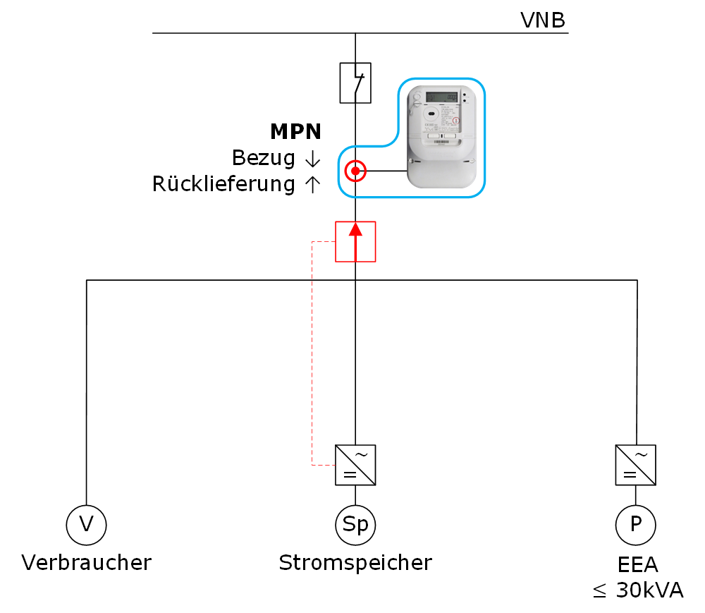 Aufgrund der Messeinrichtung wird die ins Netz zurück gelieferte Energie prioritär der EEA zugewiesen. Wenn mehr Energie ins Netz geliefert als zeitgleich von der EEA produziert wird, wird die verbleibende Energie dem Speicher zugewiesen und entsprechend abgerechnet. Für diese Zuweisung wird ein virtueller Messpunkt benötigt. Da der Energiefluss des Speichers nicht gemessen wird, kann die bezogene Energie nicht eindeutig dem Verbrauch oder der Speicherladung zugewiesen werden. Dies ist aber eine Voraussetzung für die Rückerstattung des Netznutzungsentgelts (NNE).