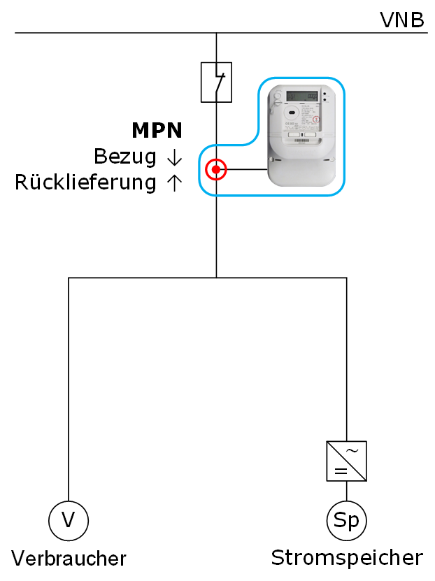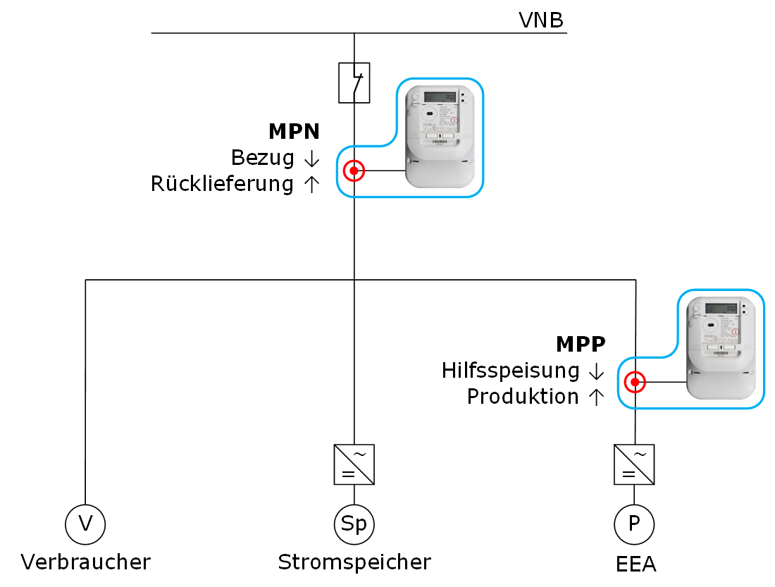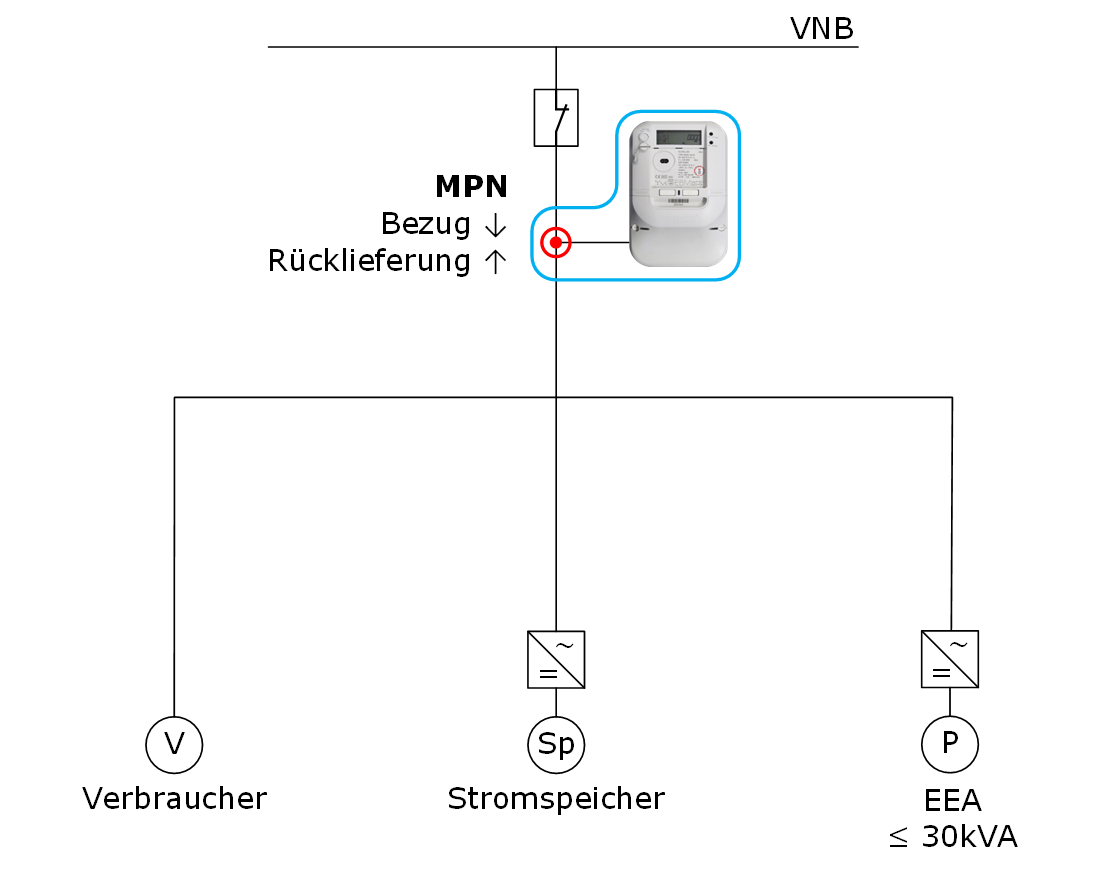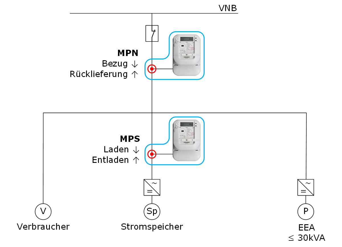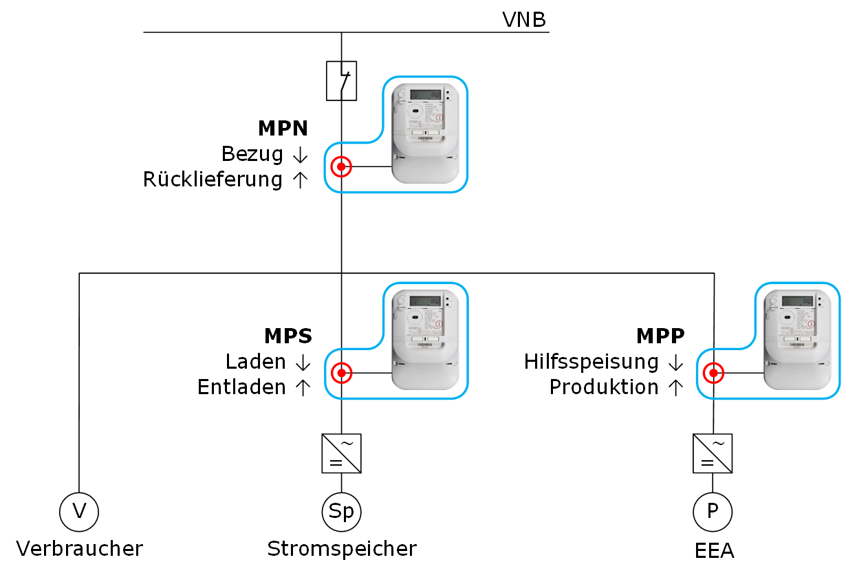 Aufgrund der Messeinrichtung wird die ins Netz zurück gelieferte Energie prioritär der EEA zugewiesen. Wenn mehr Energie ins Netz geliefert als zeitgleich von der EEA produziert wird, wird die verbleibende Energie dem Speicher zugewiesen und entsprechend abgerechnet. Für diese Zuweisung wird ein virtueller Messpunkt benötigt. Da der Energiefluss des Speichers nicht gemessen wird, kann die bezogene Energie nicht eindeutig dem Verbrauch oder der Speicherladung zugewiesen werden. Dies ist aber eine Voraussetzung für die Rückerstattung des Netznutzungsentgelts (NNE).