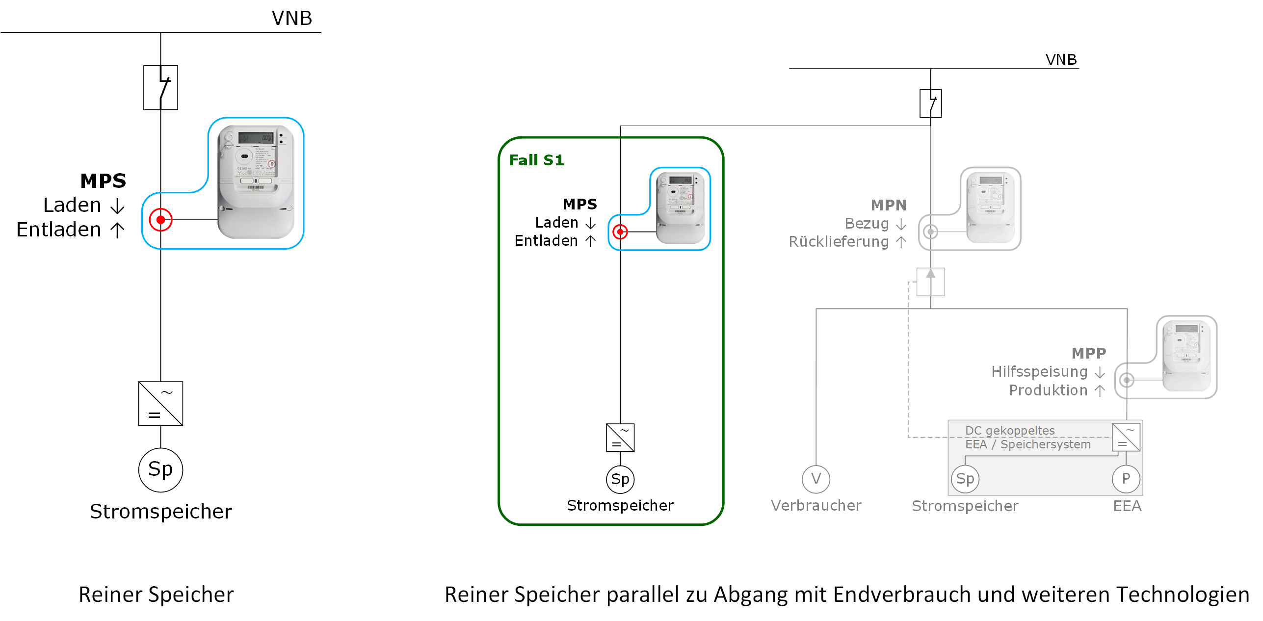 Der stationäre Speicher (MPS) und die EEA (MPP) sind separat gemessen und ohne Übergabemessung direkt am Netz angeschlossen. Somit wären es ein reiner Speicher (Fall S1) und eine direkt einspeisende EEA (Fall P1). Mit einem virtuellen Messpunkt als Übergabezähler hinter dem Anschluss wird dies zu einer Überschussanlage (kein vZEV). Der Energiefluss des Speichers aus dem und ins Netz ist nicht eingeschränkt.