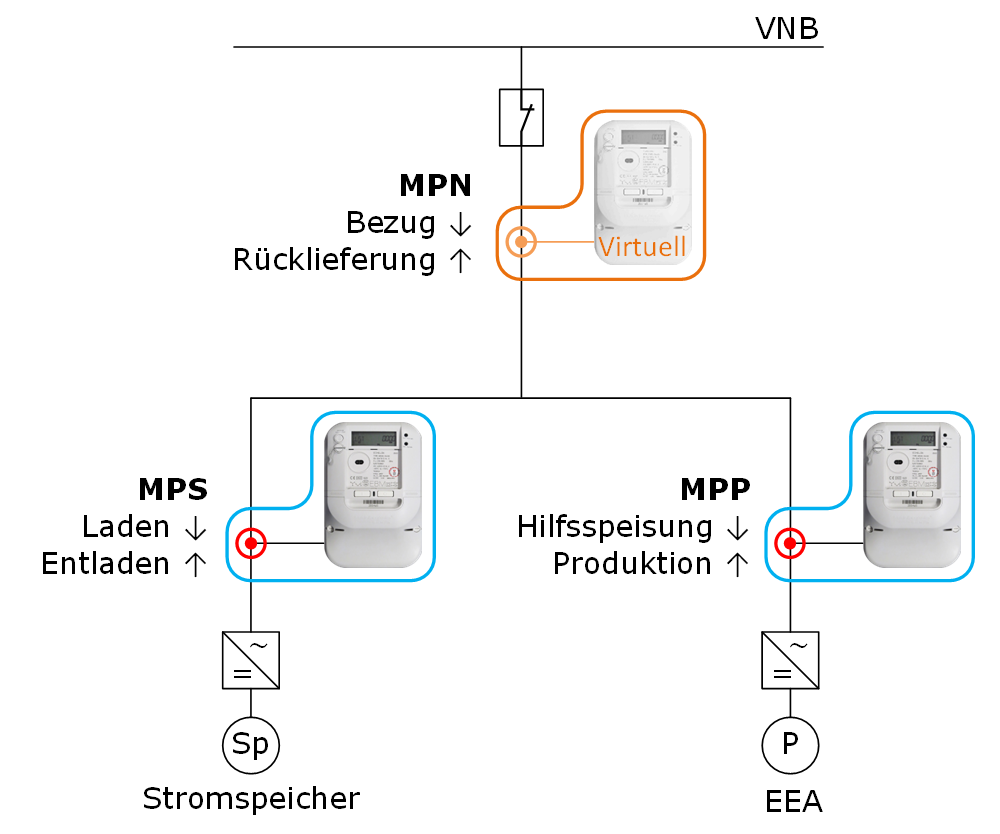 Aufgrund der Messeinrichtung wird die ins Netz gelieferte Energie prioritär dem Speicher zugewiesen. Wenn mehr Energie ins Netz geliefert als zeitgleich vom Speicher entladen wird, wird die verbleibende Energie der EEA zugewiesen und entsprechend abgerechnet. Für diese Zuweisung wird ein virtueller Messpunkt benötigt.