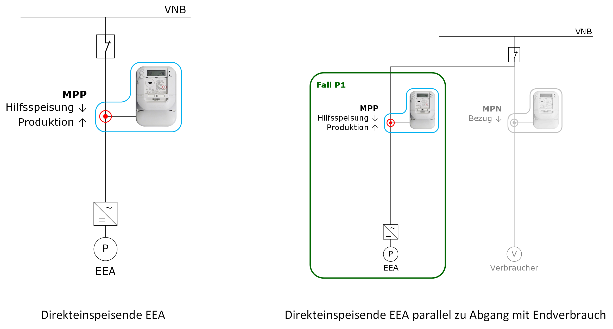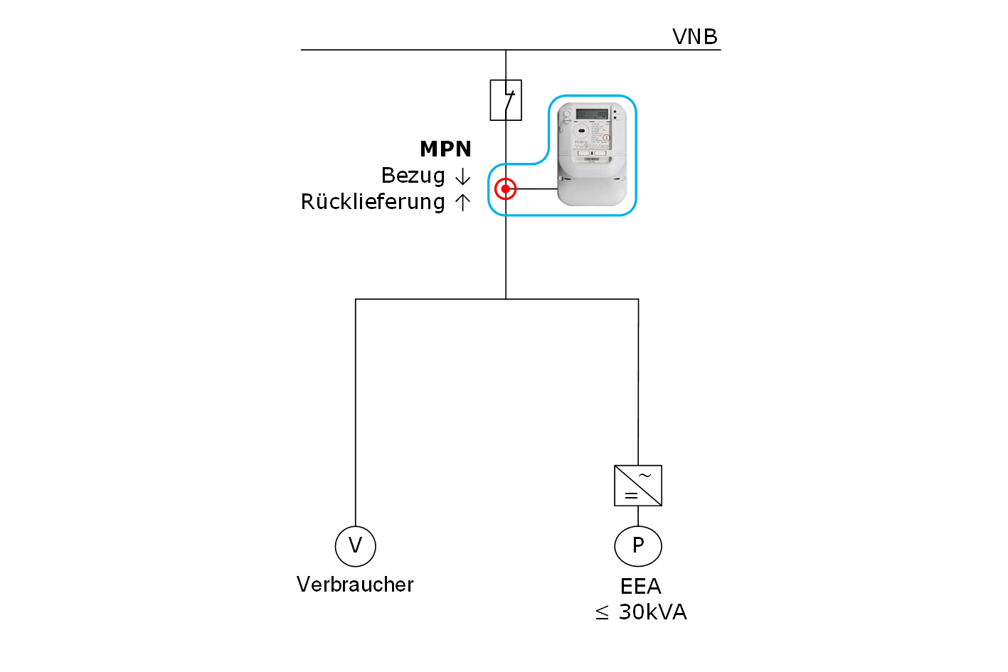 Die direkt einspeisende EEA ist ohne Verbraucher oder Speicher über den Zähler (MPP) direkt an der Eingangstrennstelle am Netz angeschlossen.