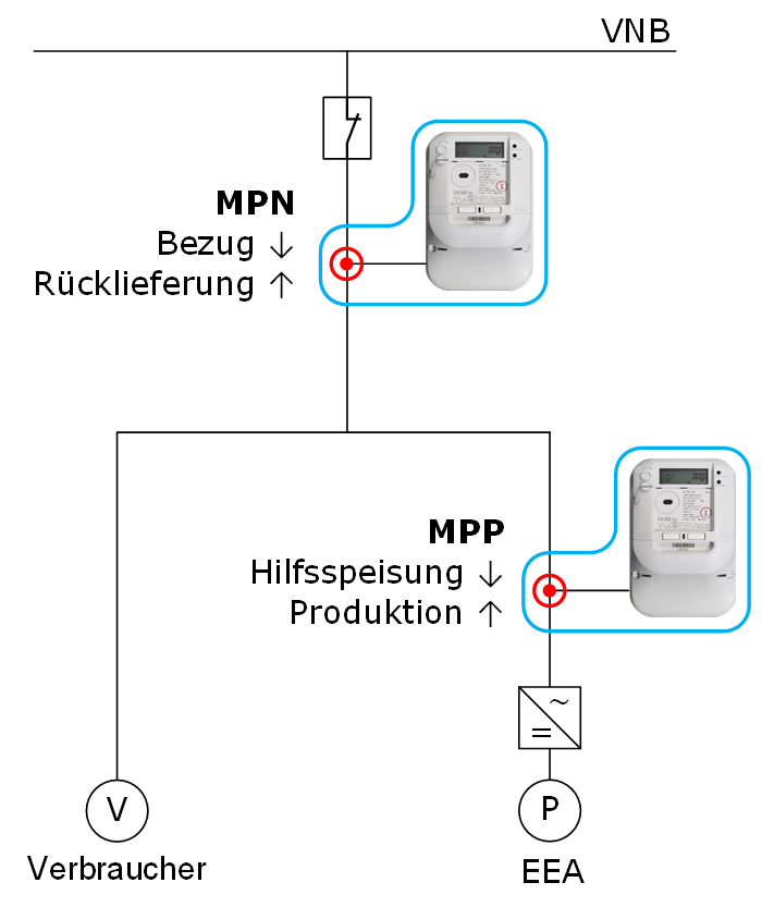 Hinter der Übergabemessung (MPN) hat es neben der Produktion mit einer Produktionsmessung (MPP) einen Verbraucher. Die Produktion dient in erster Linie dem Eigenverbrauch.