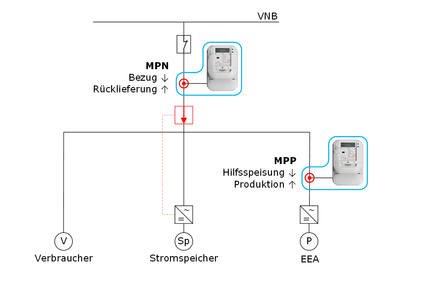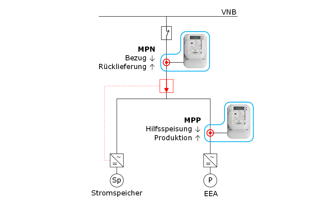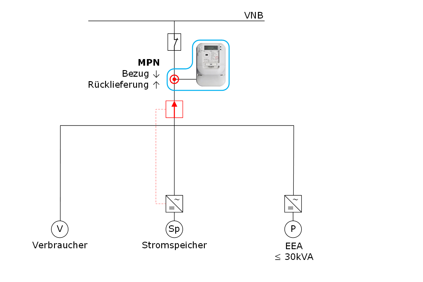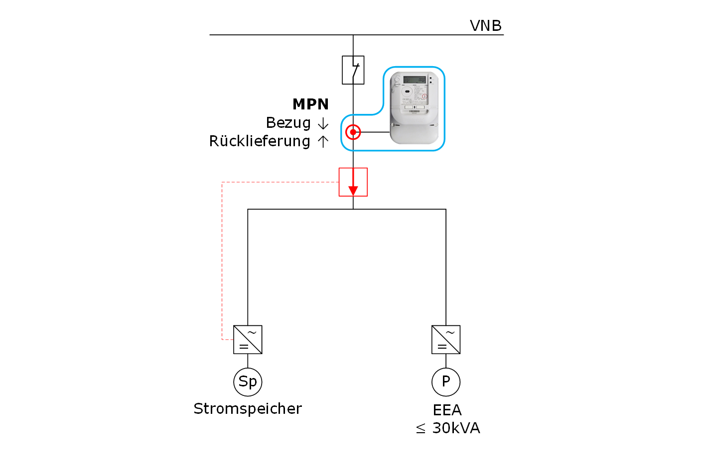 Aufgrund der Messeinrichtung wird die ins Netz zurück gelieferte Energie prioritär der EEA zugewiesen. Wenn mehr Energie ins Netz geliefert als zeitgleich von der EEA produziert wird, wird die verbleibende Energie dem Speicher zugewiesen und entsprechend abgerechnet. Für diese Zuweisung wird ein virtueller Messpunkt benötigt. Da der Energiefluss des Speichers nicht gemessen wird, kann die bezogene Energie nicht eindeutig dem Verbrauch oder der Speicherladung zugewiesen werden. Dies ist aber eine Voraussetzung für die Rückerstattung des Netznutzungsentgelts (NNE).