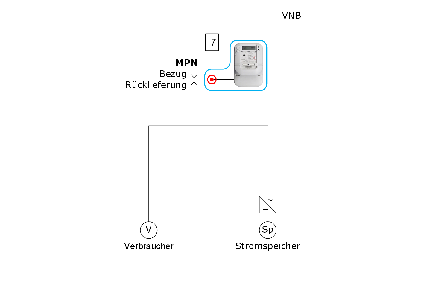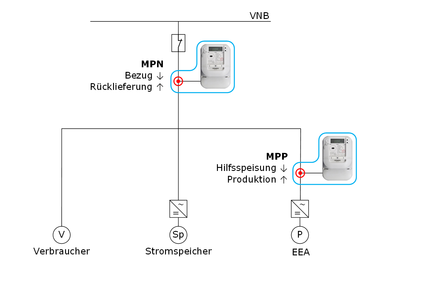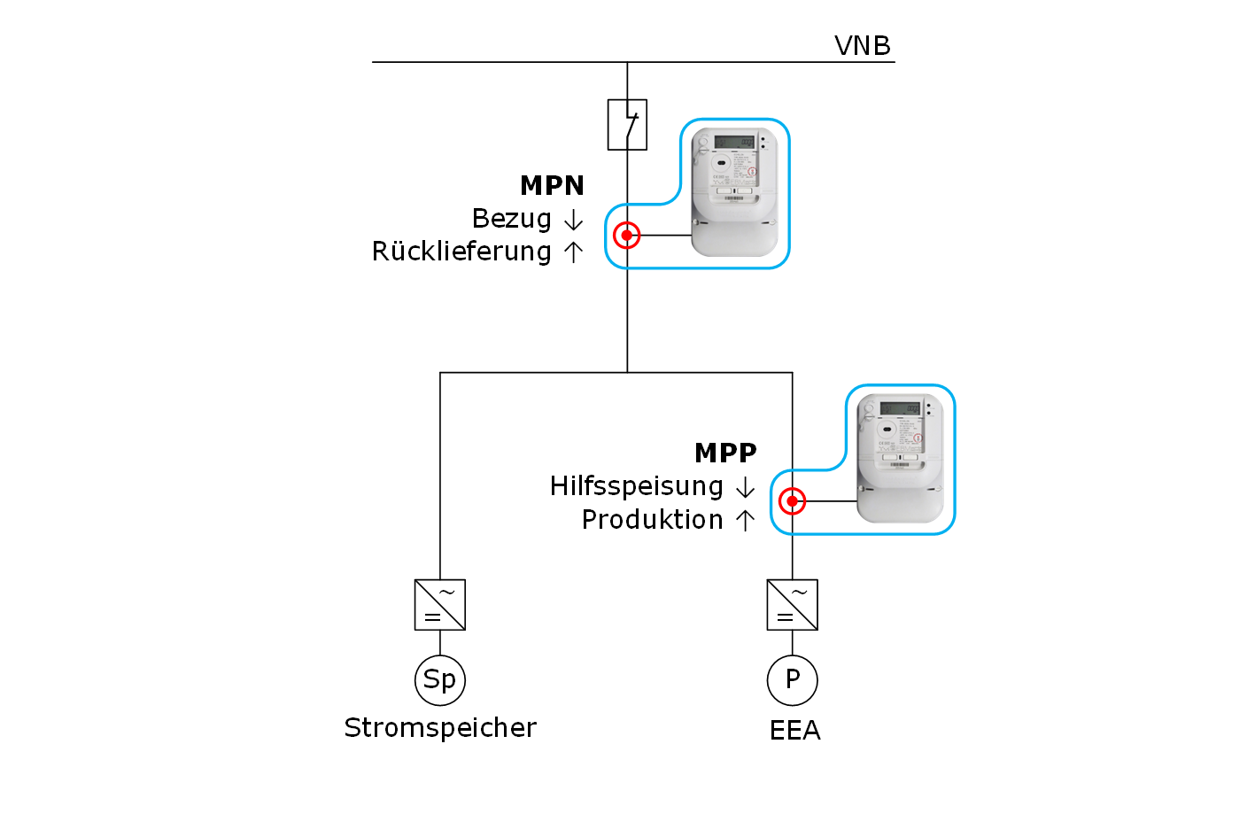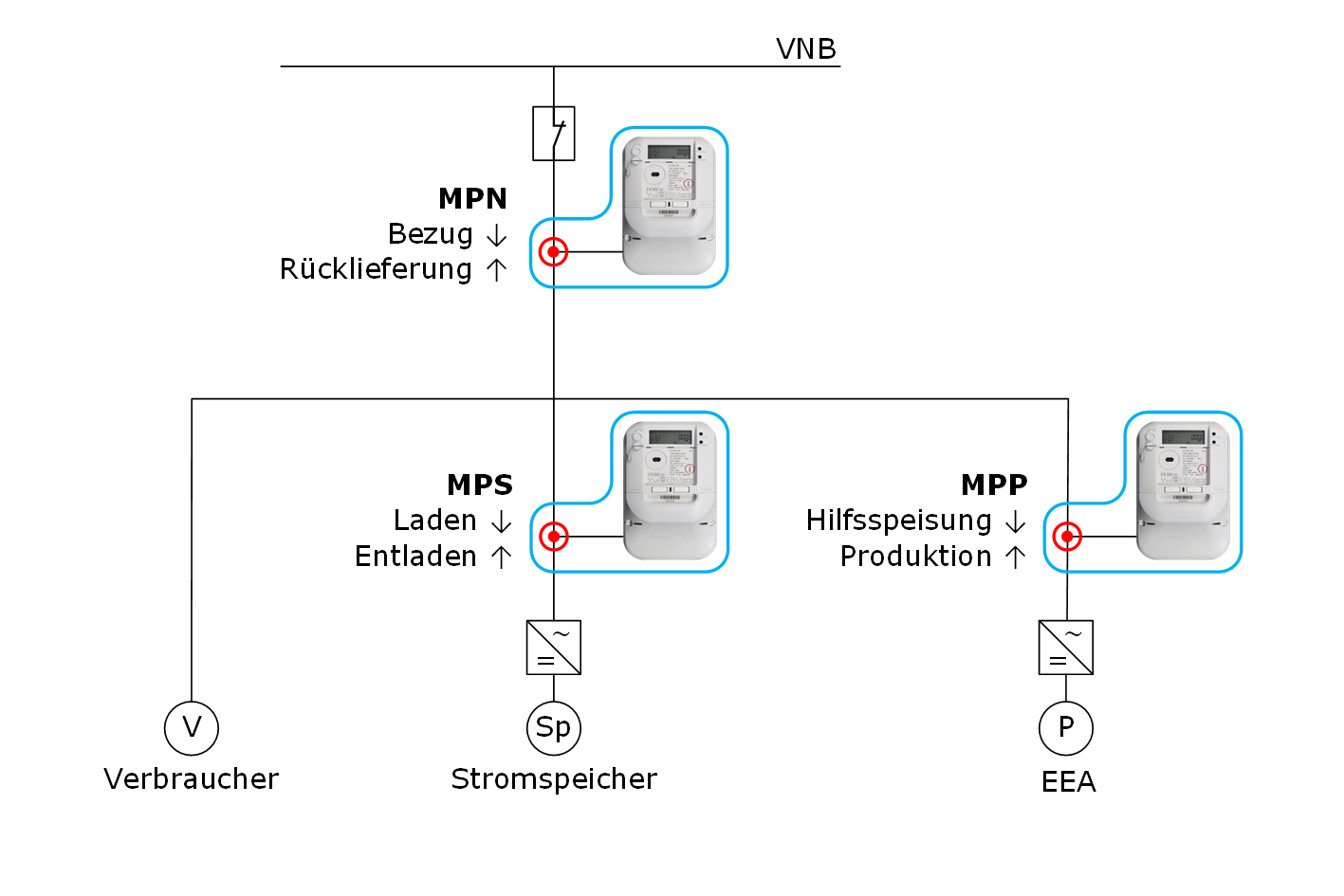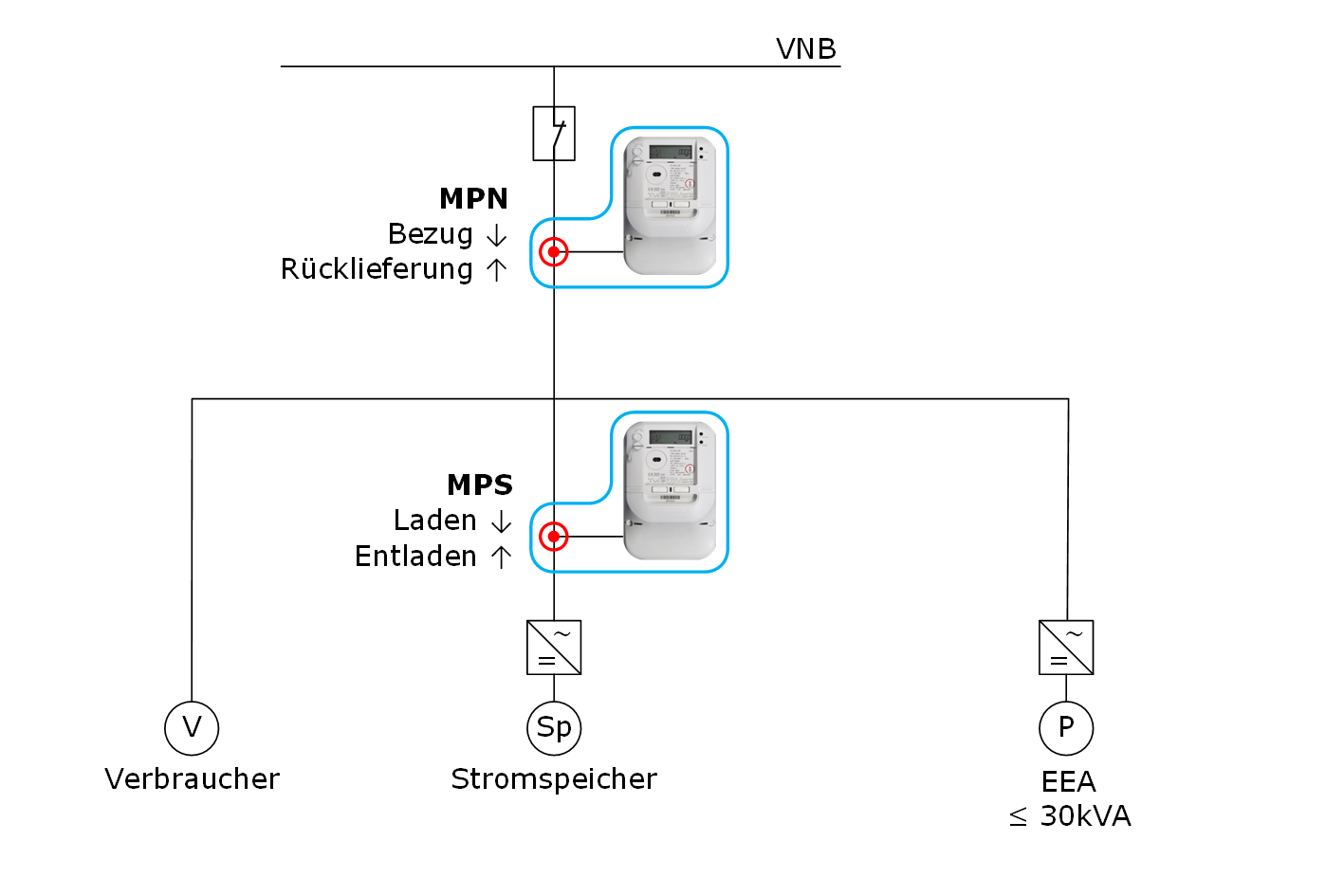 Aufgrund der Messeinrichtung wird die ins Netz zurück gelieferte Energie prioritär der EEA zugewiesen. Wenn mehr Energie ins Netz geliefert als zeitgleich von der EEA produziert wird, wird die verbleibende Energie dem Speicher zugewiesen und entsprechend abgerechnet. Für diese Zuweisung wird ein virtueller Messpunkt benötigt. Da der Energiefluss des Speichers nicht gemessen wird, kann die bezogene Energie nicht eindeutig dem Verbrauch oder der Speicherladung zugewiesen werden. Dies ist aber eine Voraussetzung für die Rückerstattung des Netznutzungsentgelts (NNE).