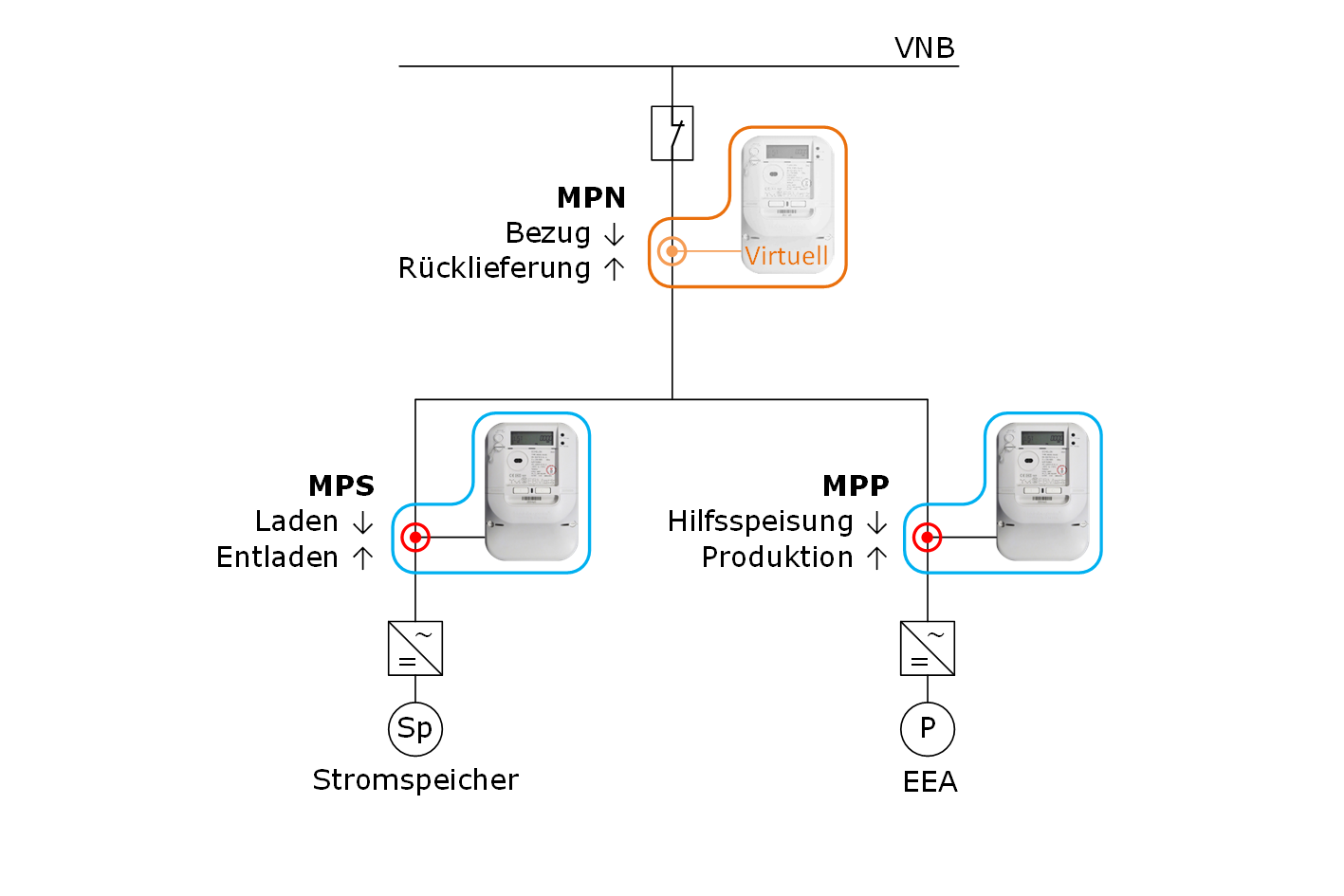 Aufgrund der Messeinrichtung wird die ins Netz gelieferte Energie prioritär dem Speicher zugewiesen. Wenn mehr Energie ins Netz geliefert als zeitgleich vom Speicher entladen wird, wird die verbleibende Energie der EEA zugewiesen und entsprechend abgerechnet. Für diese Zuweisung wird ein virtueller Messpunkt benötigt.
