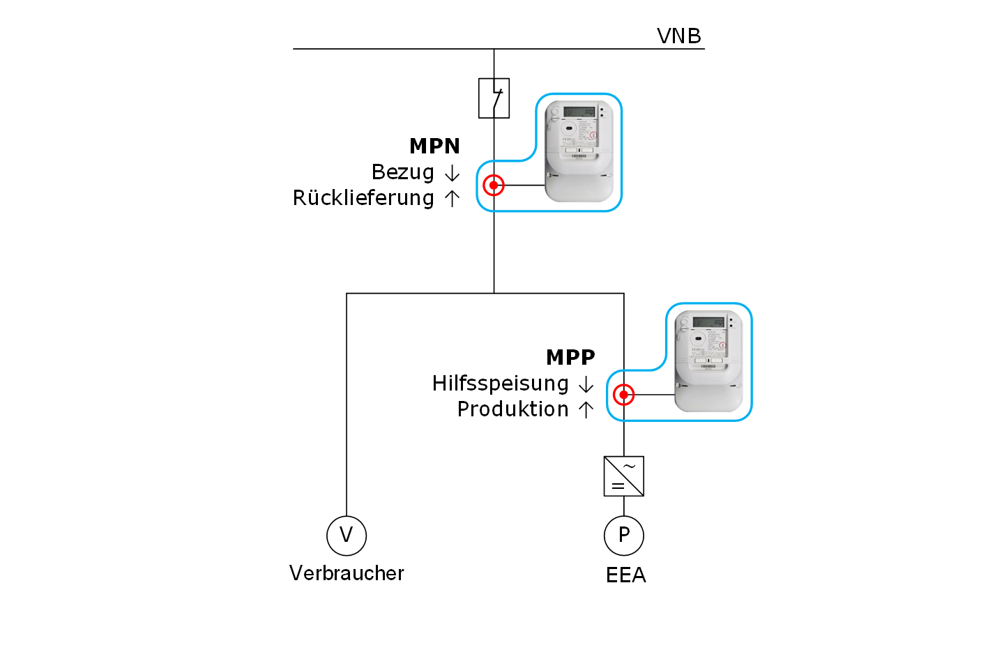 Hinter der Übergabemessung (MPN) hat es neben der Produktion mit einer Produktionsmessung (MPP) einen Verbraucher. Die Produktion dient in erster Linie dem Eigenverbrauch.