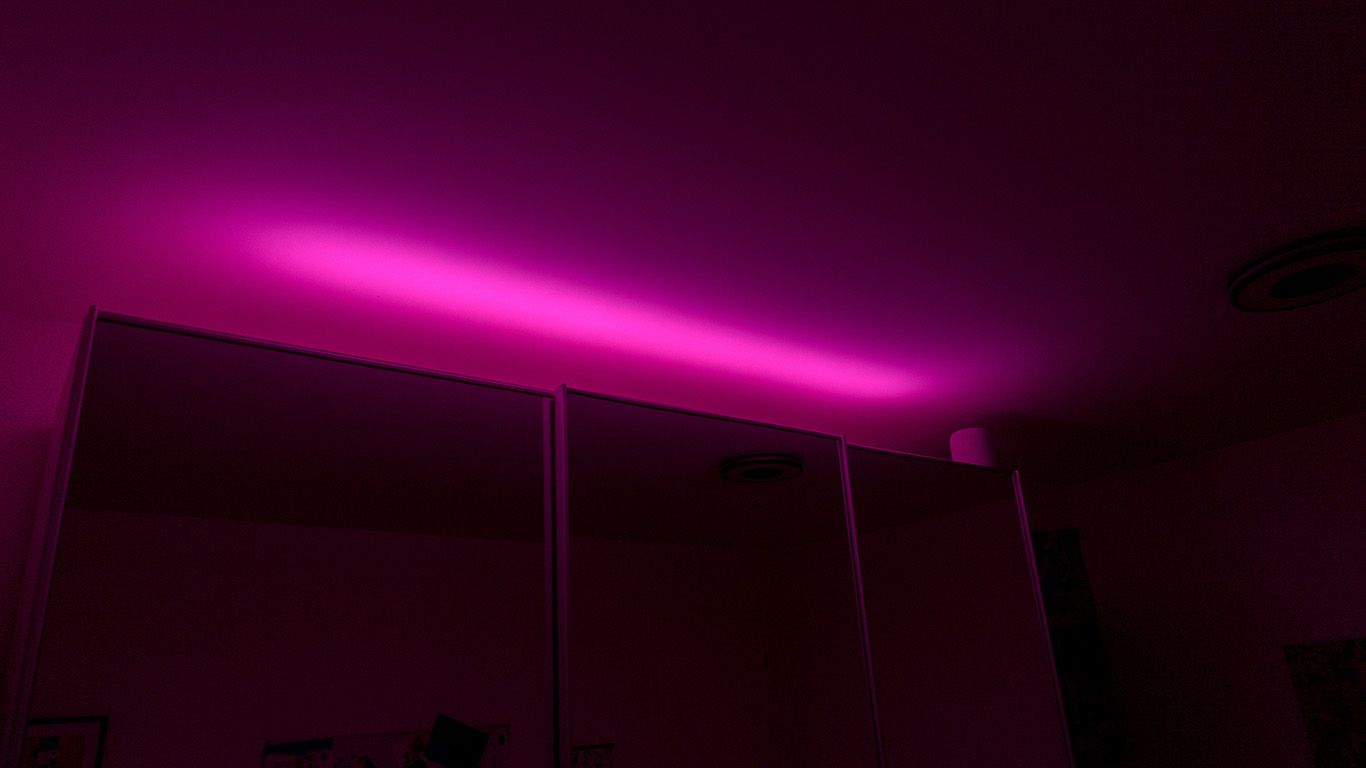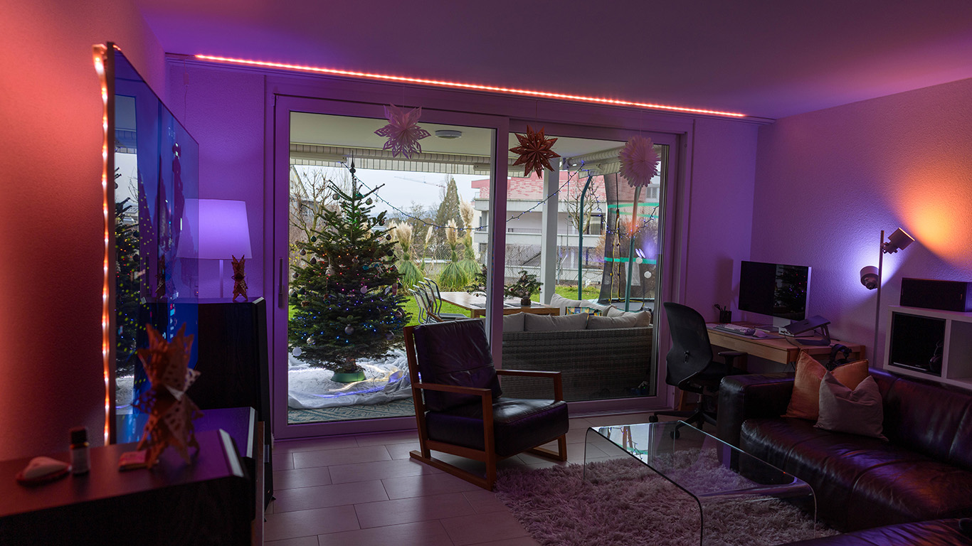 Auch beim Fernsehen spielt Beleuchtung inzwischen eine grosse Rolle. Hinter unserem TV klebt ein Philipps Hue-LED-Lightstrip, der für stimmungsvolles Hintergrundlicht sorgt. Früher war er über die Philips Hue-Sync-Box mit dem TV gekoppelt, sodass die Lichtfarben zum aktuellen Bild passten. Die Idee war genial, die Umsetzung leider weniger: Das Gerät machte selten, was es sollte, und kam beim letzten Umzug gleich mit aufs Elektroschrott‑Depot.