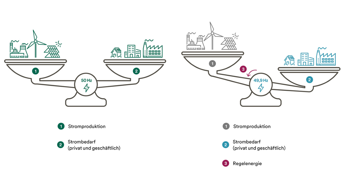 Produktion und Verbrauch von Strom müssen sich immer exakt die Waage halten. Dann liegt die Netzfrequenz bei 50 Hertz. Wird zu wenig Strom produziert, sinkt die Frequenz – wird zu viel produziert, steigt sie. Bei Abweichungen von 0,2 Hertz oder mehr nach oben kann das Stromnetz zusammenbrechen. Die Folge wären grossflächige Blackouts.
