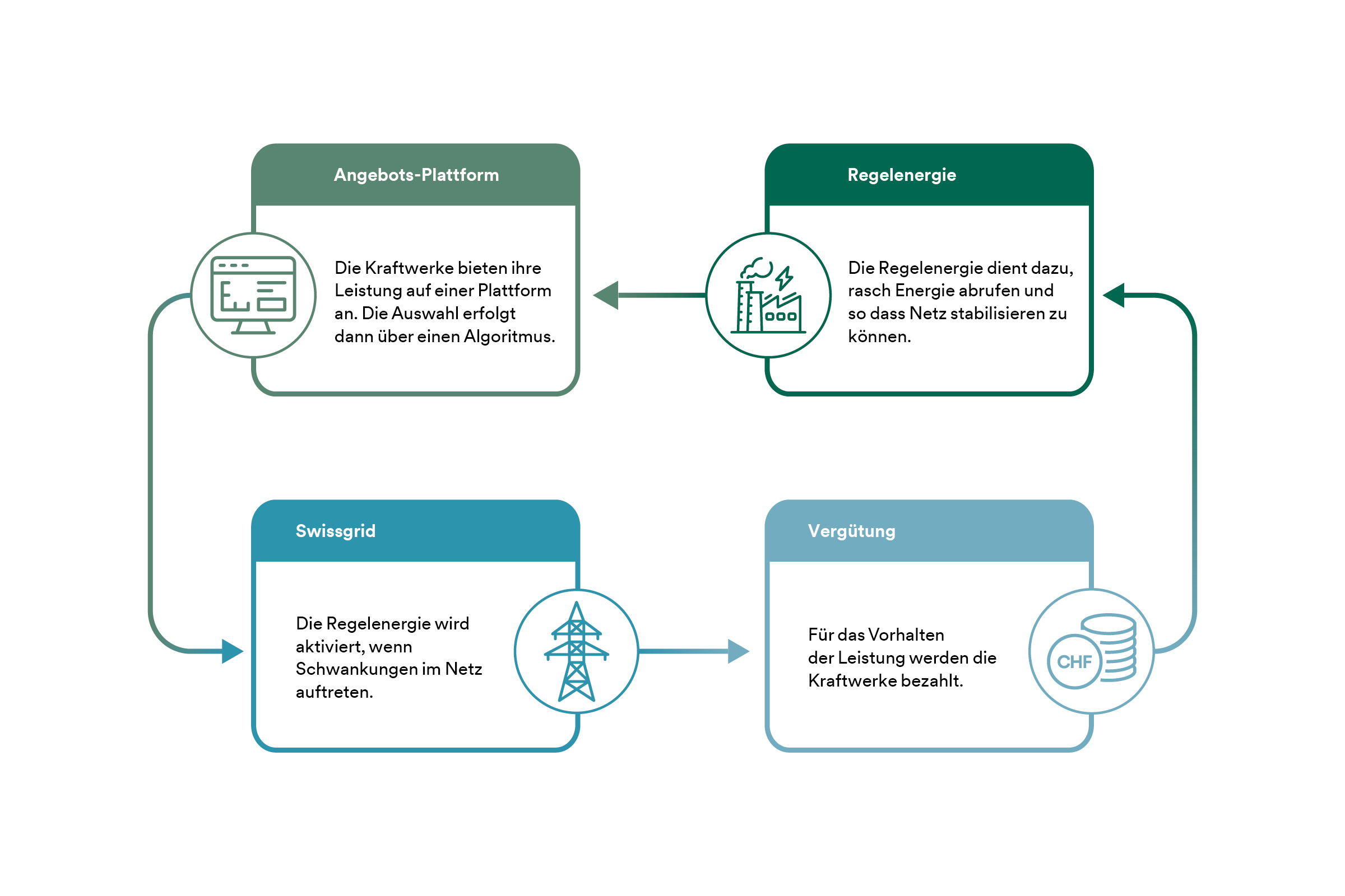 Der Regelenergiemarkt funktioniert über eine Auktionsplattform, auf der Kraftwerksbetreiber Angebote machen können. Das günstigste Gebot erhält den Zuschlag für die Vorhaltung. Wird Regelenergie gebraucht, ruft der Übertragungsnetzzbetreiber Swissgrid diese ab. Die Anbieter werden separat für die Vorhaltung wie auch für die abgerufene Energie entschädigt.