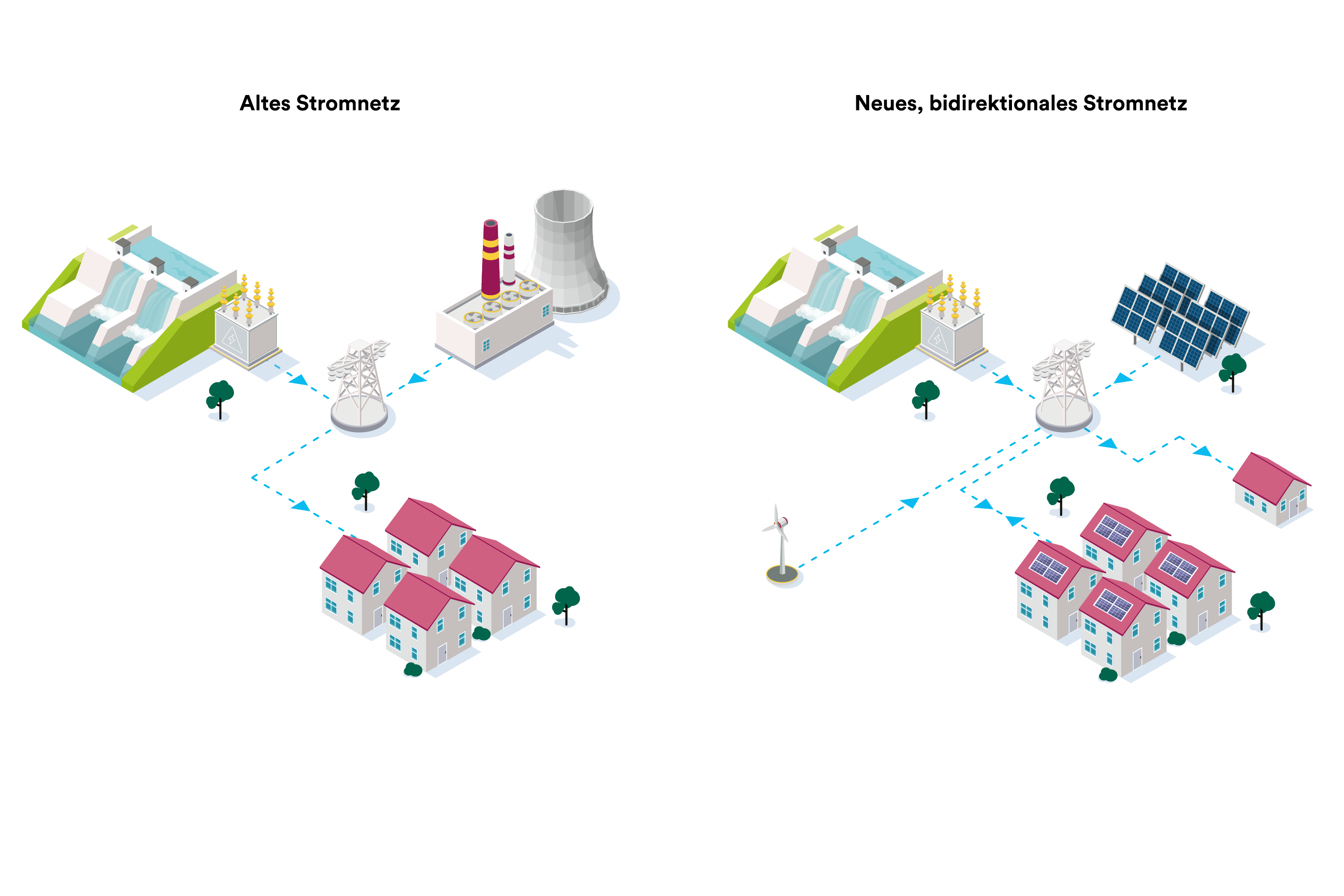 Im alten Netz floss der Strom in eine Richtung vom Kraftwerk zum Verbraucher. Im neuen Netz speisen zahlreiche, dezentrale Anlagen in das Netz ein, Strom fliesst in beide Richtungen.